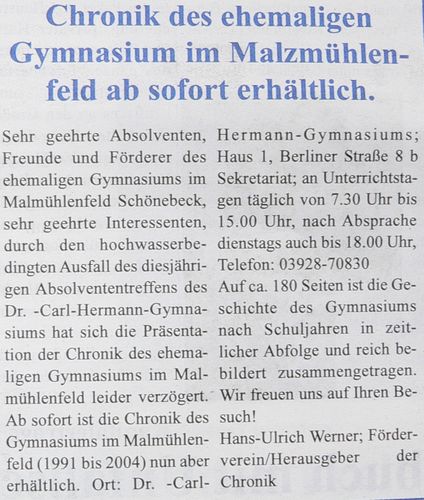 Seit kurzem gibt es die Chronik des Gymnasium im Malzmühlenfeld