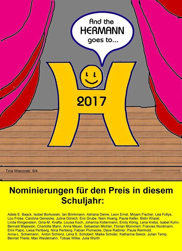 Für besondere Leistungen wird in den bekannten Kategorien jährlich der Schulpreis, der "Hermann", verliehen. Dazu sind vorallem die Nominierten, Schüler, Eltern und Gäste eingeladen der Verleihung beizuwohnen. Wir freuen uns über die besonderen Leistungen der Schüler und Gratulieren zu den "Hermanns".